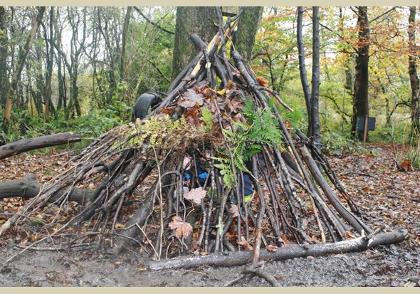 4. Protéger des éléments – utilisez des branches plus petites et des brindilles pour couvrir la cabane. Mettez-les dans les trous pour protéger du vent de la pluie.
